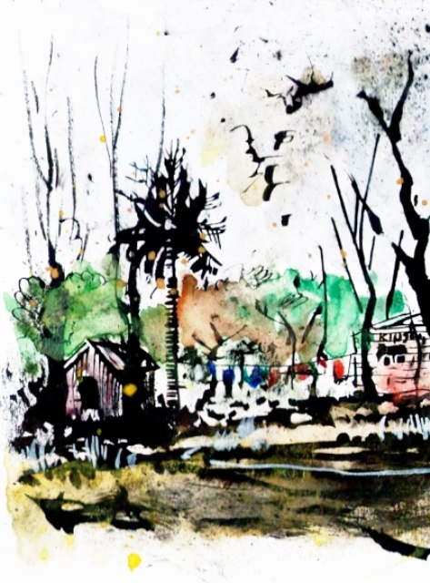 Las nubes tapan el sol, ellos intentan imaginarlo para dibujar, el niño vuelve a salir, juega cerca de la casilla de chapa, un perro flaco y negro lo mira, sobre ellos la ropa del alambre cuelga cabeza abajo pero sin cabeza.
