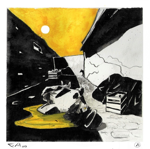 Delante de él un cuerpo, con levita y la cadena de un reloj saliendo de un bolsillo. Al darle vuelta comprende que no se trata del dueño de esas prendas, sino de otro saqueador al que la muerte alcanzó antes de soltar el botín. Mira los zapatos brillantes, aunque cubiertos de polvo.