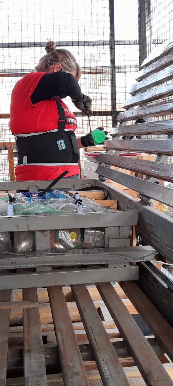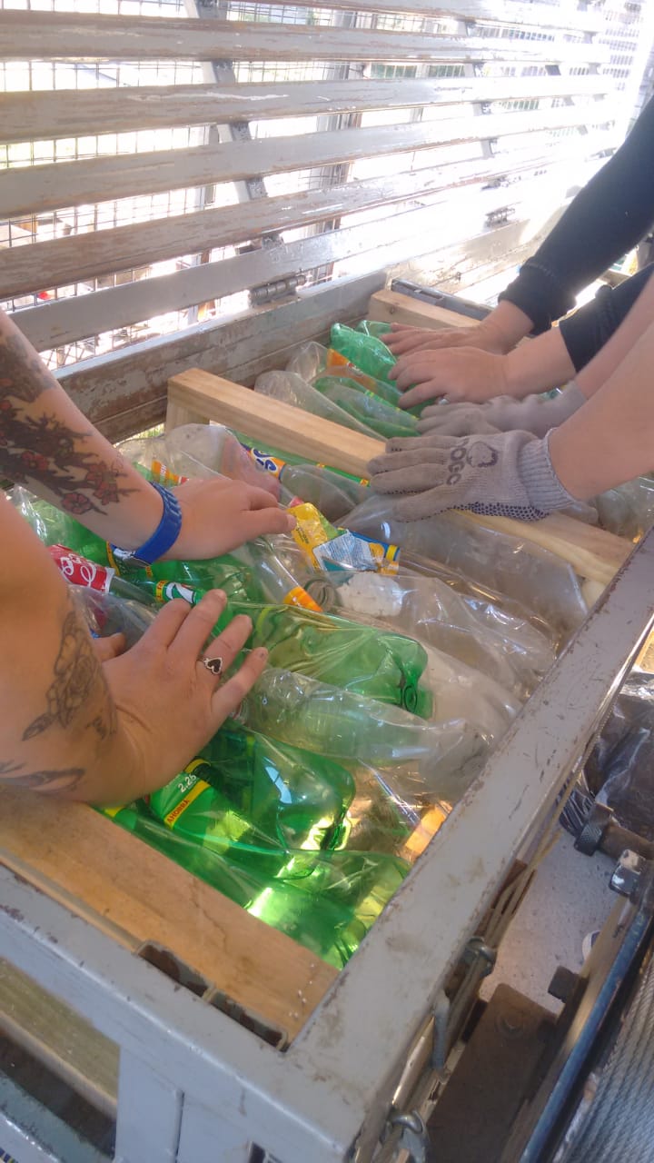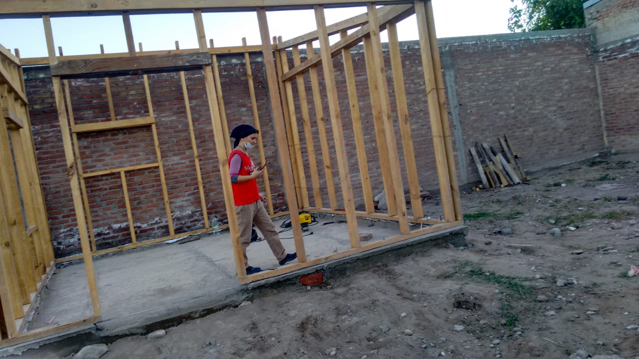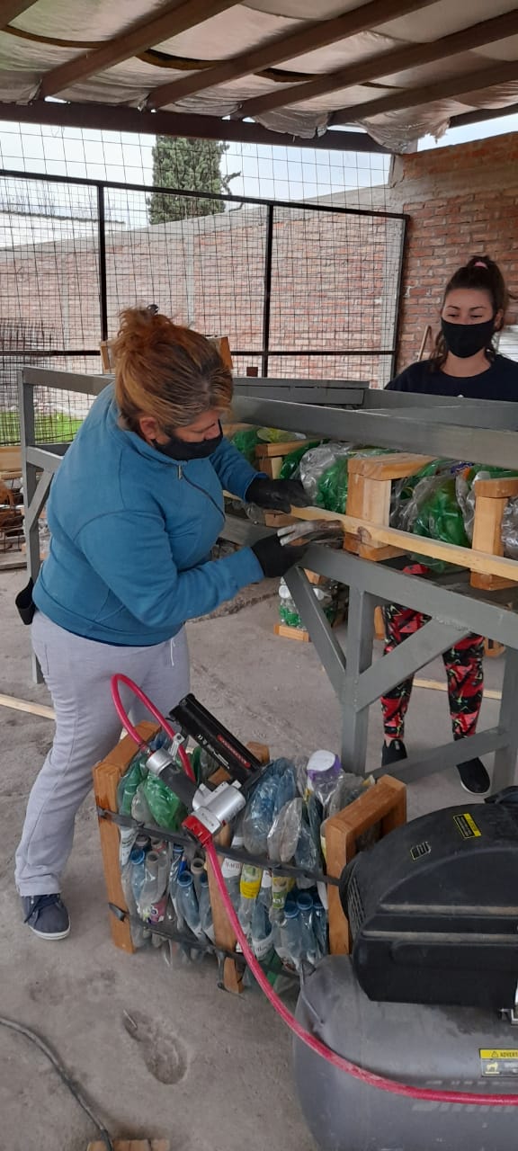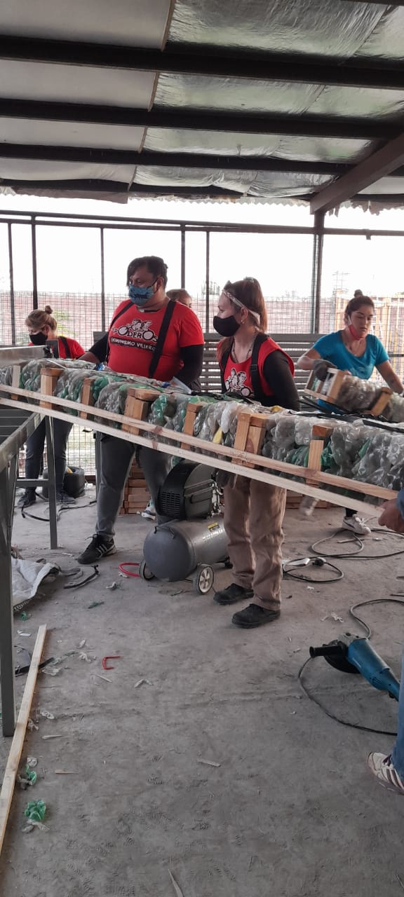 ―El método de construcción se llama MPRA: módulo, plástico, recuperado, auto-portante. Está aprobado en otras provincias como Córdoba y Santa Fe. La capacitación se realizó en Mendoza Ciudad y participaron 15 compañeros de la organización. Nosotrxs realizamos las máquinas: prensa, la máquina bastidora, la matriz y la mesa de trabajo, toda laboriosidad de metalurgia. Previamente tenemos que hacer una base de 4×4 (plataforma de cemento y hierro), donde dejamos unas varillas roscadas cada 60 cm. A estas les llamamos peines, donde van a ir abulonadas las retículas de madera. Para que se entienda mejor, con alfajías de 10x5x2,40 hacemos un tipo de “reja” y la calzamos sobre los peines que dejamos de varilla roscada, luego las abulonamos y se procede a techar, para lograr la firmeza necesaria. También tengo que mencionar que queda superliviano, eso hace posible que cualquier persona pueda construir.