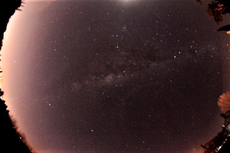 La Luna nueva de este mes se producirá el lunes 6, a las 21:53, de modo que esa noche será la más oscura. Este mes, el centro de nuestra galaxia, la Vía Láctea, continúa bien alto atravesando todo el cielo, encima de nuestras cabezas, como puede apreciarse en la imagen obtenida con una lente ojo de pez.