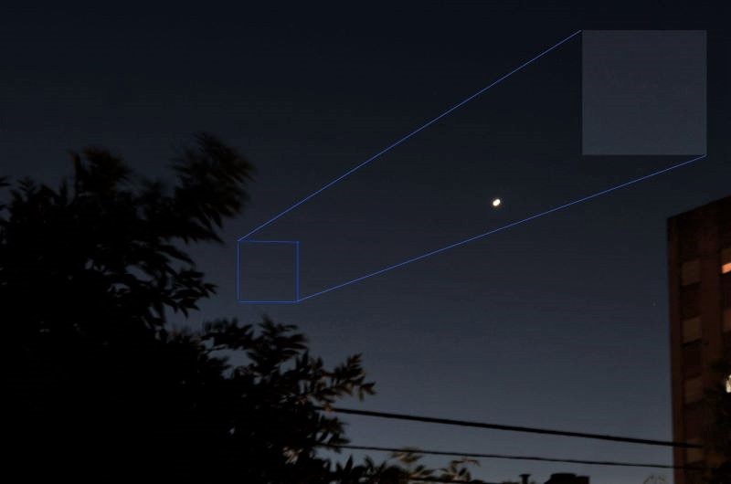 El cometa Leonard desde la ciudad de La Plata, el 16/12/21 a las 20:57 hora local. Nótese la manchita en la ampliación de la zona enmarcada en azul